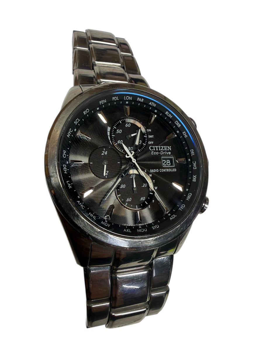 For sale, we have a Citizen Eco-Drive Radio Controlled Men’s Watch H800-S080606 43mm. This pre-owned watch is in good working condition and keeps time as it should. Cosmetically, it shows normal signs of prior use including scratches and scuffs on the bracelet, and the wording on the case back shows some fading from regular wear. Overall, it still presents well and remains a sharp, functional everyday timepiece.