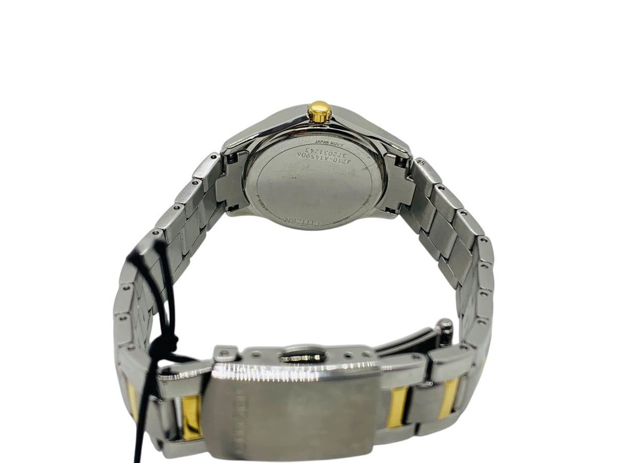 For sale, we have a Citizen Eco-Drive Two-Tone Stainless Steel Quartz Women’s Watch, model J710-A145906. This pre-owned watch is in excellent cosmetic condition overall and presents very well, with only light hairline scratches on the case, case back, and band consistent with normal prior wear. The crystal is clean and clear, and the watch is fully functional.