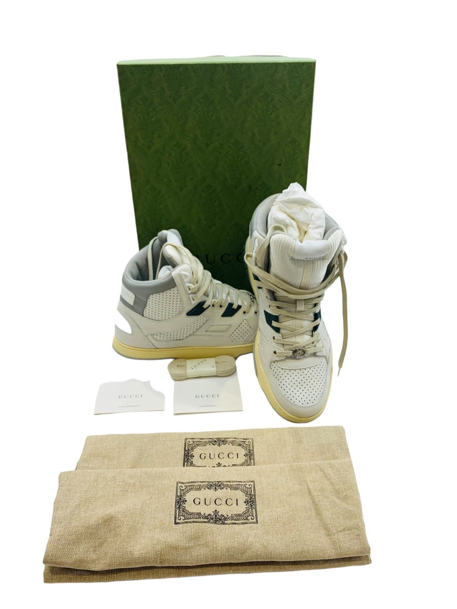 For sale, we have a pair of Gucci 765437 Interlocking G High-Cut Distressed Effect Sneakers, size 40 1/2 (equivalent to U.S. Men’s size 7). These sneakers are new/open box and have only been tried on — they have never been worn outdoors or used. The sneakers feature Gucci’s signature Interlocking G design with a stylish distressed finish, offering a luxury streetwear look that stands out.