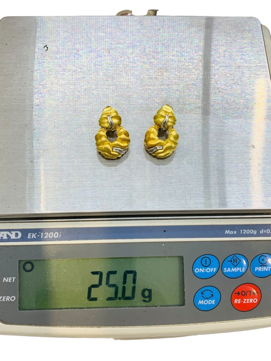 Description: For sale, we have a pair of Henry Dunay Sabi 18k/Plat Two-Tone Brushed Knot-Style Clip Earrings. These stunning earrings are in like new condition with no notable signs of wear. Expertly crafted, they feature Henry Dunay’s signature Sabi brushed finish and a sophisticated two-tone design combining 18k yellow gold and 950 platinum. The earrings weigh a total of 25 grams and are fitted with secure clip-on backs, making them suitable for both pierced and non-pierced ears. Please see the photos, as the photos show the exact items included and the exact condition of the item(s). Please feel free to reach out to us if you have any questions prior to purchasing. Thank you!