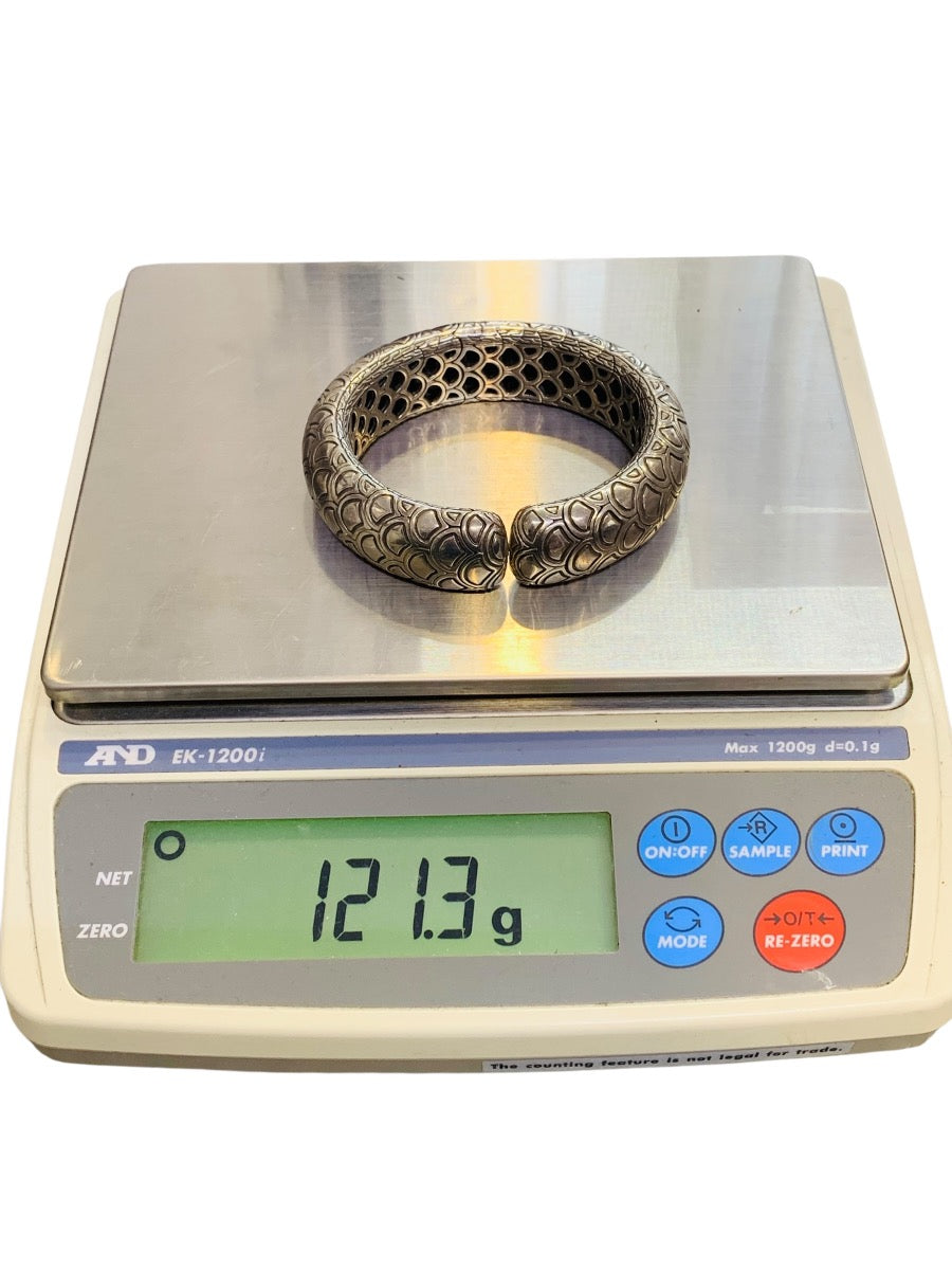 Specifications: Sterling Silver .925, flexible cuff design, 7" inner circumference, approximately 20mm wide, weighing 121.2 grams. Comes with: Bracelet only, NO original box or paperwork included. This is a bold and timeless piece, ideal for collectors or those seeking a statement bracelet that blends luxury with artisan design. Please see the photos, as they show the exact item and condition. Feel free to reach out with any questions prior to purchase. Thank you! Condition: Pre-owned, good condition with normal surface wear from use. Comes with: Bracelet only, no box or papers.