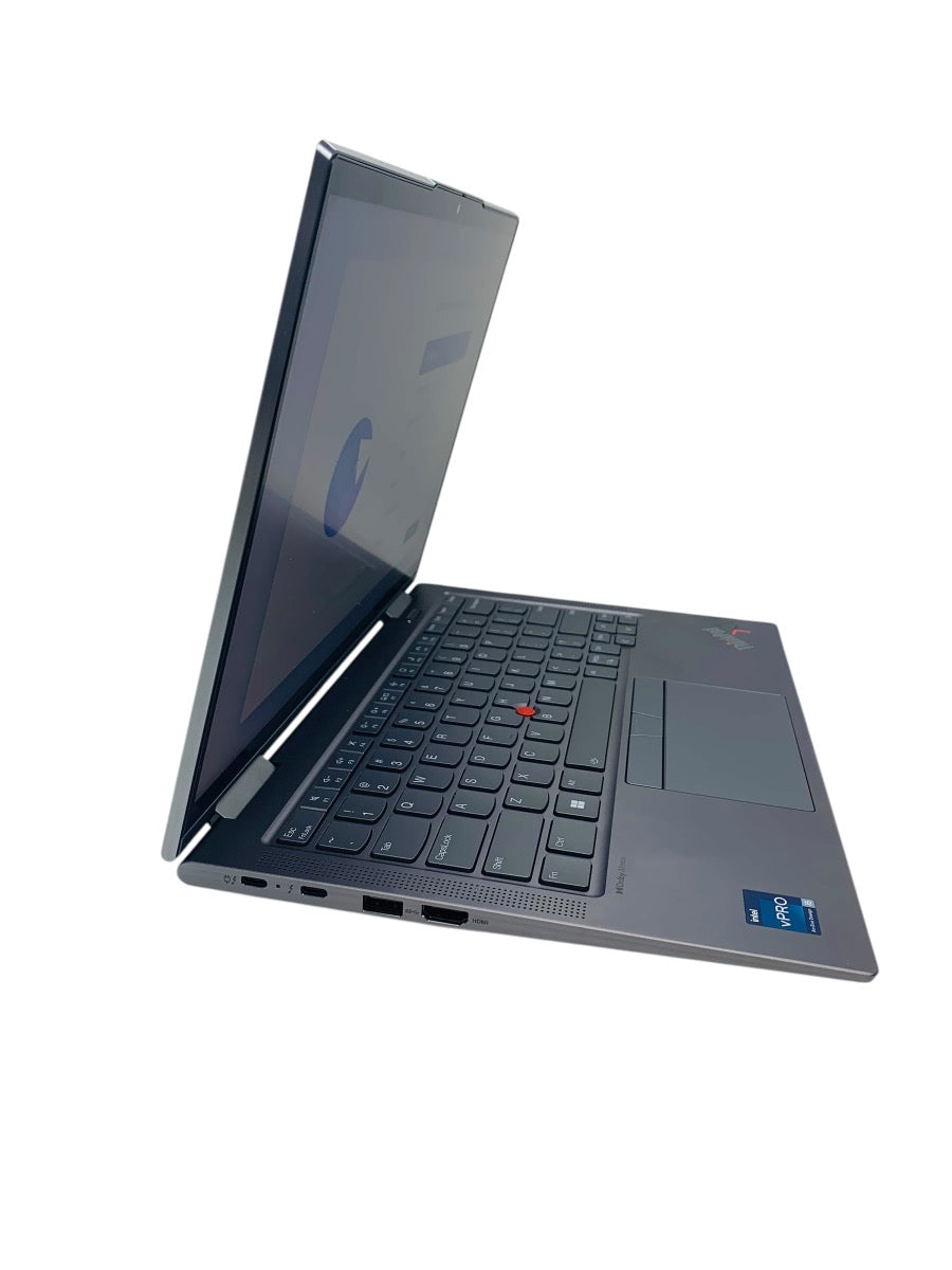 For sale, we have a Lenovo ThinkPad X1 Yoga Gen 8 2-in-1 Laptop featuring an Intel Core i5 13th Generation processor, 16GB of RAM, and a 256GB SSD. This is a pre-owned unit that is in like new cosmetic condition, showing no damage and no visible wear on the corners. The touchscreen display and keypad are both in proper working condition, and the unit presents very clean overall with minimal to no signs of prior use.
