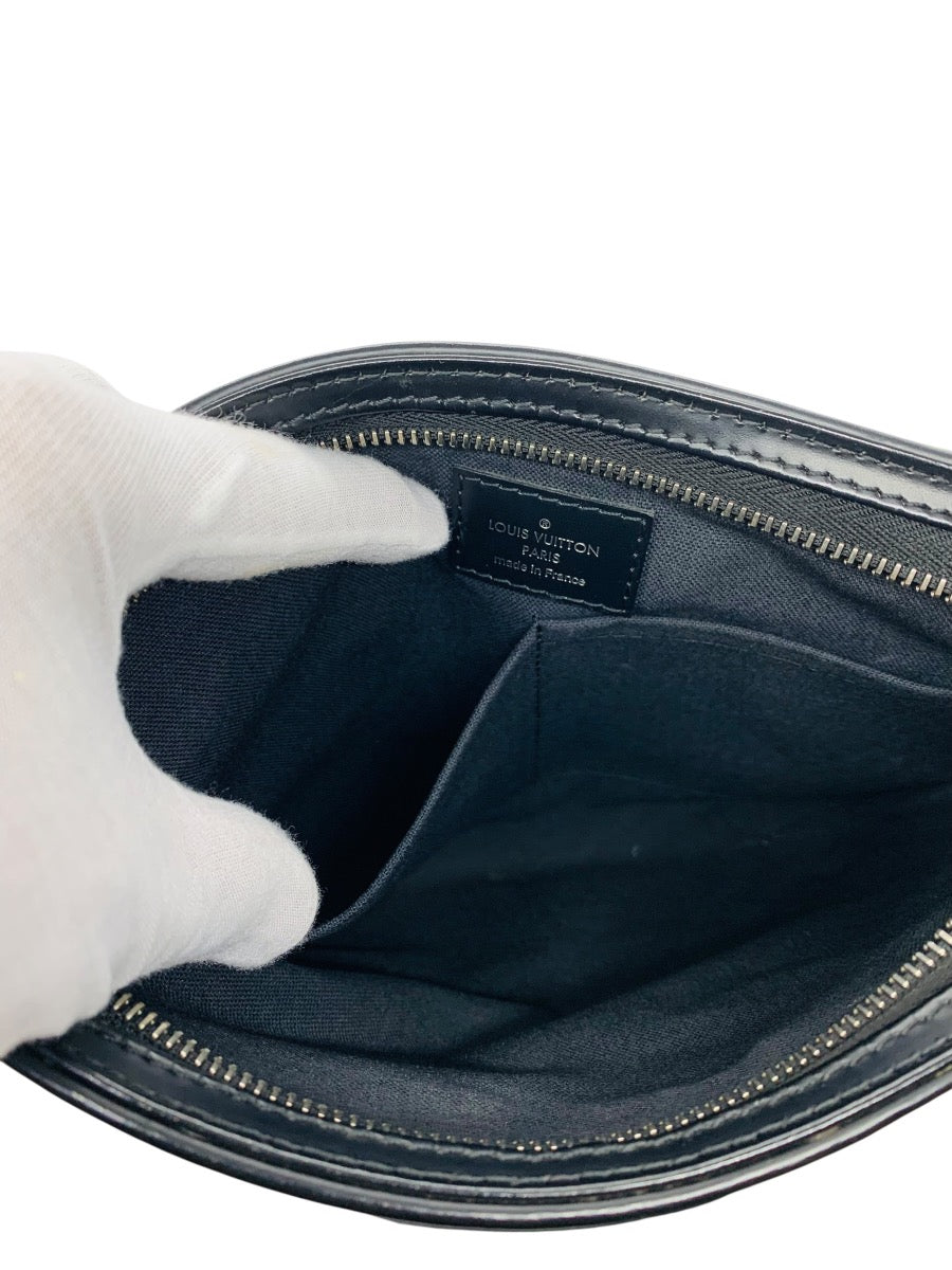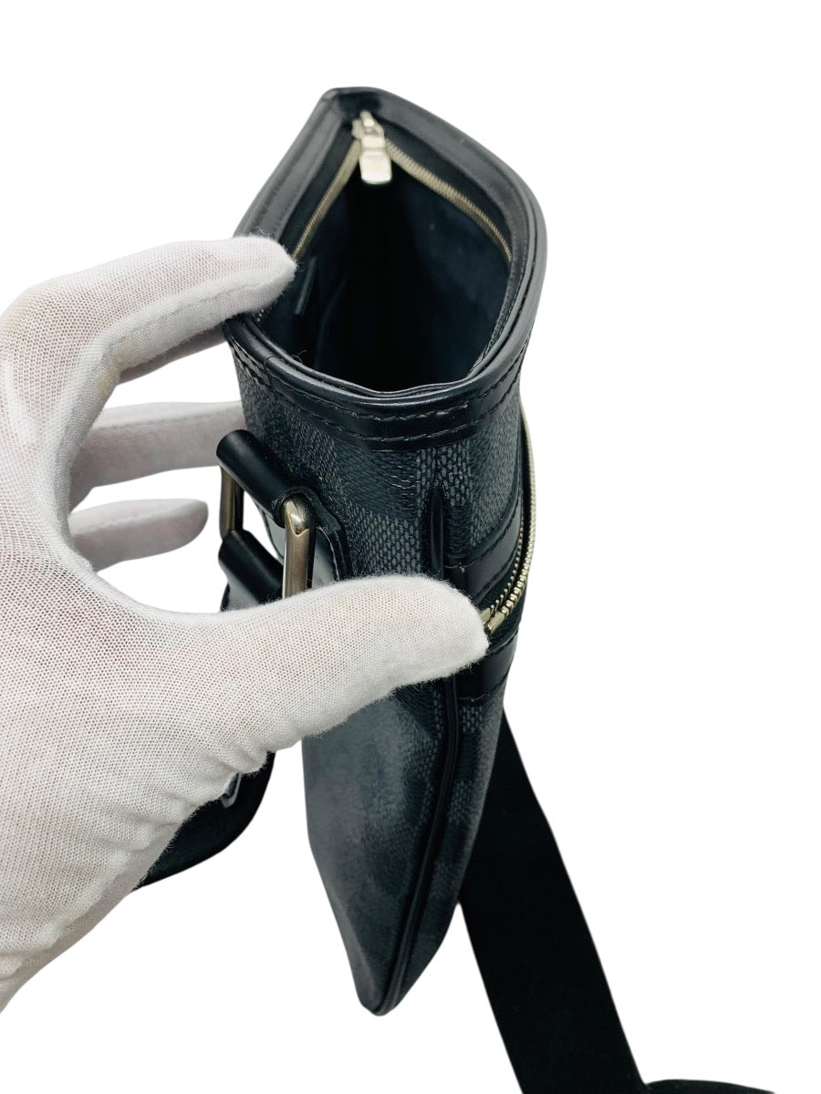 Features: Signature Damier Graphite coated canvas, black leather trim, adjustable crossbody strap, silver-tone hardware, front zip pocket, and top zip closure