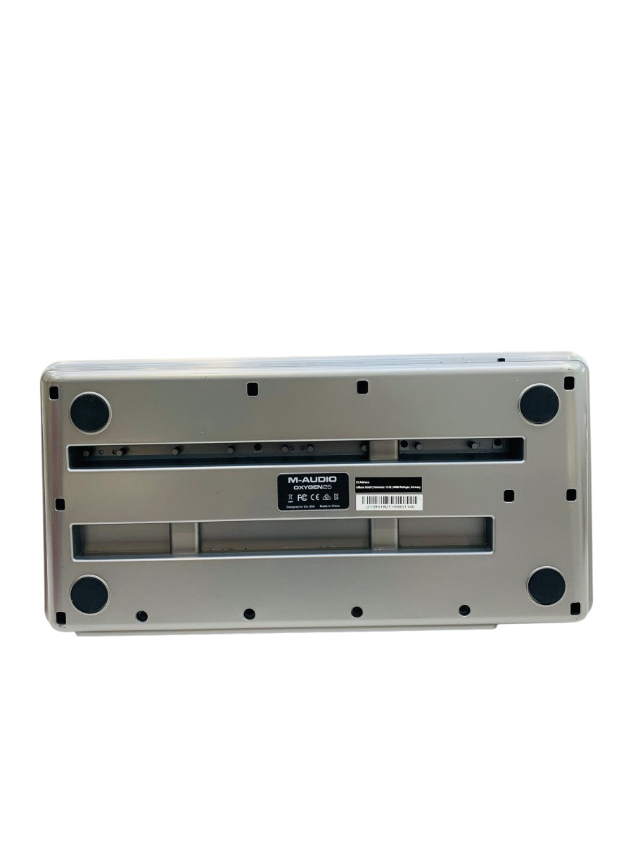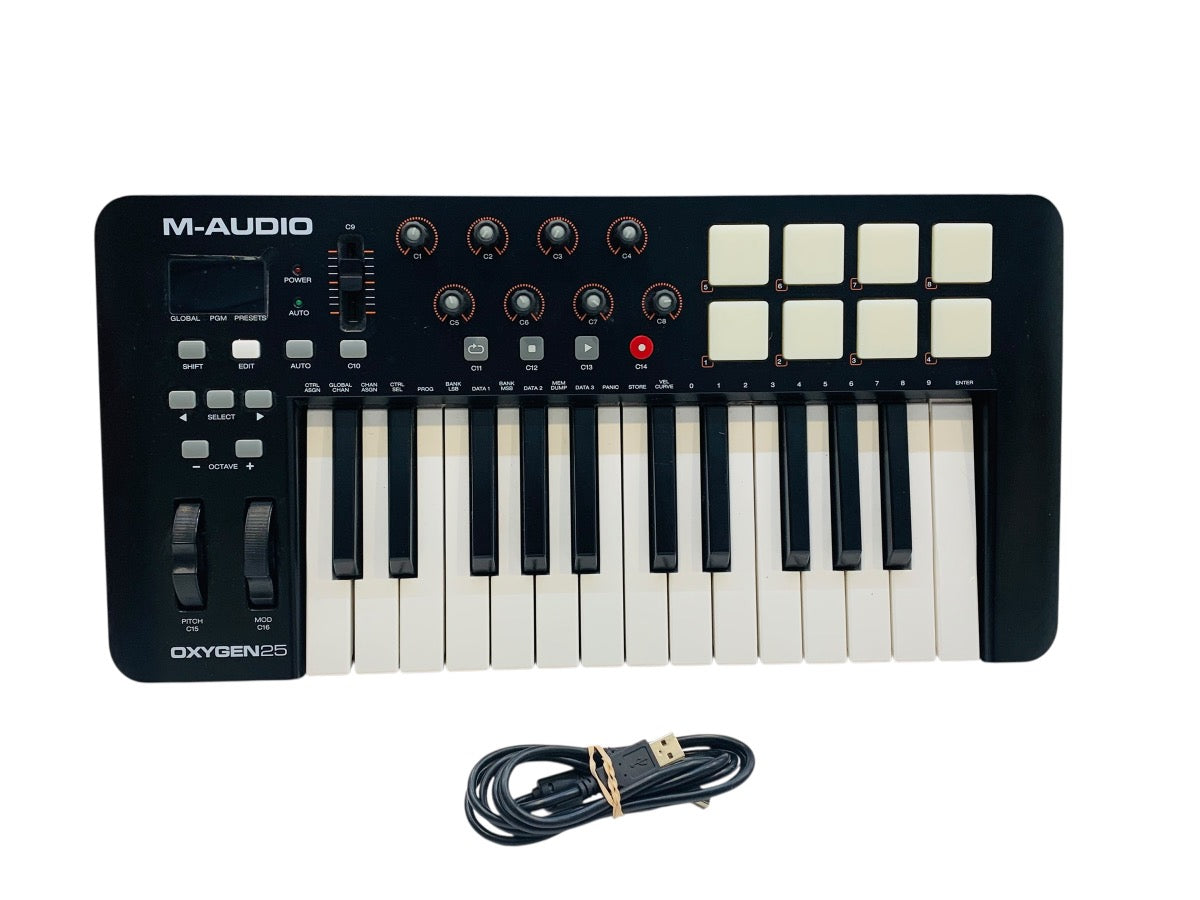 For sale, we have a M-Audio Oxygen 25 25-key Keyboard MIDI Controller. This pre-owned controller is in good condition with minor signs of use, such as light surface scratches, but it is fully functional. It features 25 full-size velocity-sensitive keys, 8 assignable knobs, 8 trigger pads, and a USB connection for easy plug-and-play with your computer. The listing includes the M-Audio Oxygen 25 controller and a USB cable. This compact and versatile MIDI controller is perfect for musicians, producers, and home studio setups looking for a portable and responsive keyboard. Please see the photos, as they show the exact items included and the exact condition of the item. Please feel free to reach out to us if you have any questions prior to purchasing. Thank you!