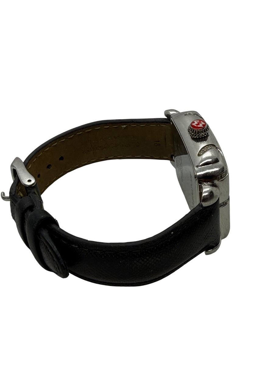 For sale, we have a Michele Deco Safari Zebra MW06T01F7922 0.38CTW Swiss Quartz Watch. This pre-owned watch is in working condition and keeps time as it should. The crystal shows heavy scratches from prior use, and the case also has visible scratches throughout, consistent with regular wear, but it remains a stylish and eye-catching timepiece.
