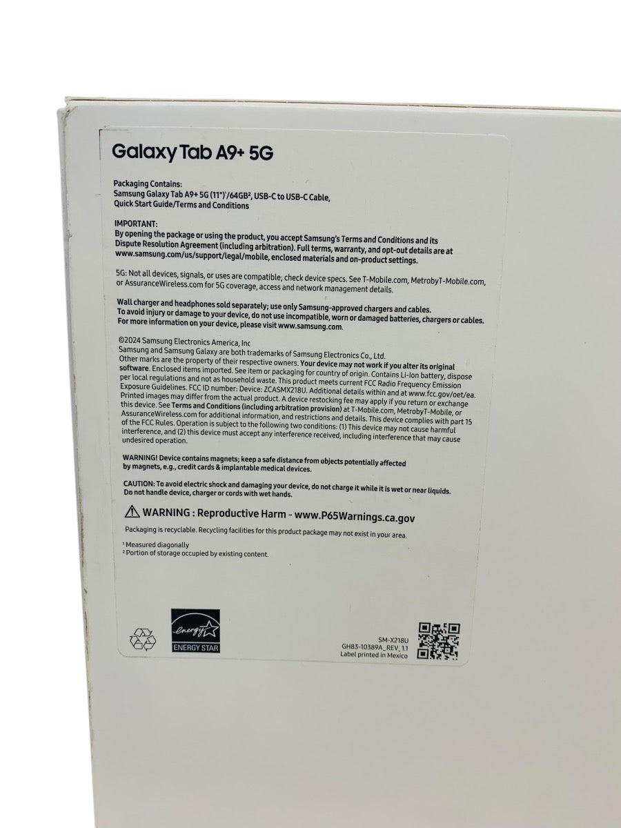 Description: For sale, we have a Samsung Galaxy Tab A9+ 5G 11" Tablet with 64GB storage. This unit is in like new condition with minimal signs of prior handling and works exactly as intended. The screen, body, and buttons are all clean with no notable defects. This model features a sharp 11" display, 5G connectivity, fast performance, and 64GB of onboard storage—perfect for streaming, productivity, or everyday use. Items included are the factory box, manuals, original dust cover, and a USB-C charging cable. No additional accessories are included. All things considered, this is a great choice for anyone seeking a fast, modern Samsung tablet at a terrific value. Please see the photos, as the photos show the exact items included and the exact condition of the item(s). Please feel free to reach out to us if you have any questions prior to purchasing. Thank you! Specifications: * Model: Samsung Galaxy Tab A9+ 5G * Display: 11" * Storage: 64GB * Connectivity: 5G * Operating system: Factory reset, ready for new owner Condition: Like new, very minimal signs of handling, no major scratches or damage observed Comes with: Factory box, manuals, original dust cover, USB-C cable (no additional accessories)