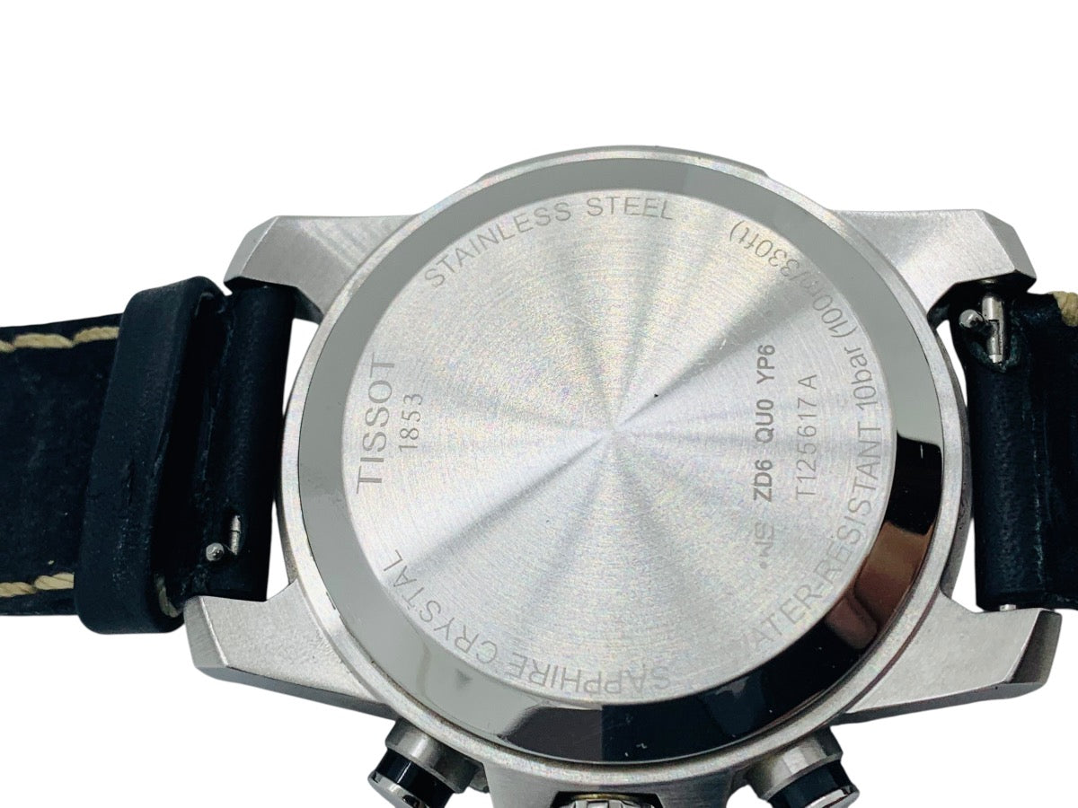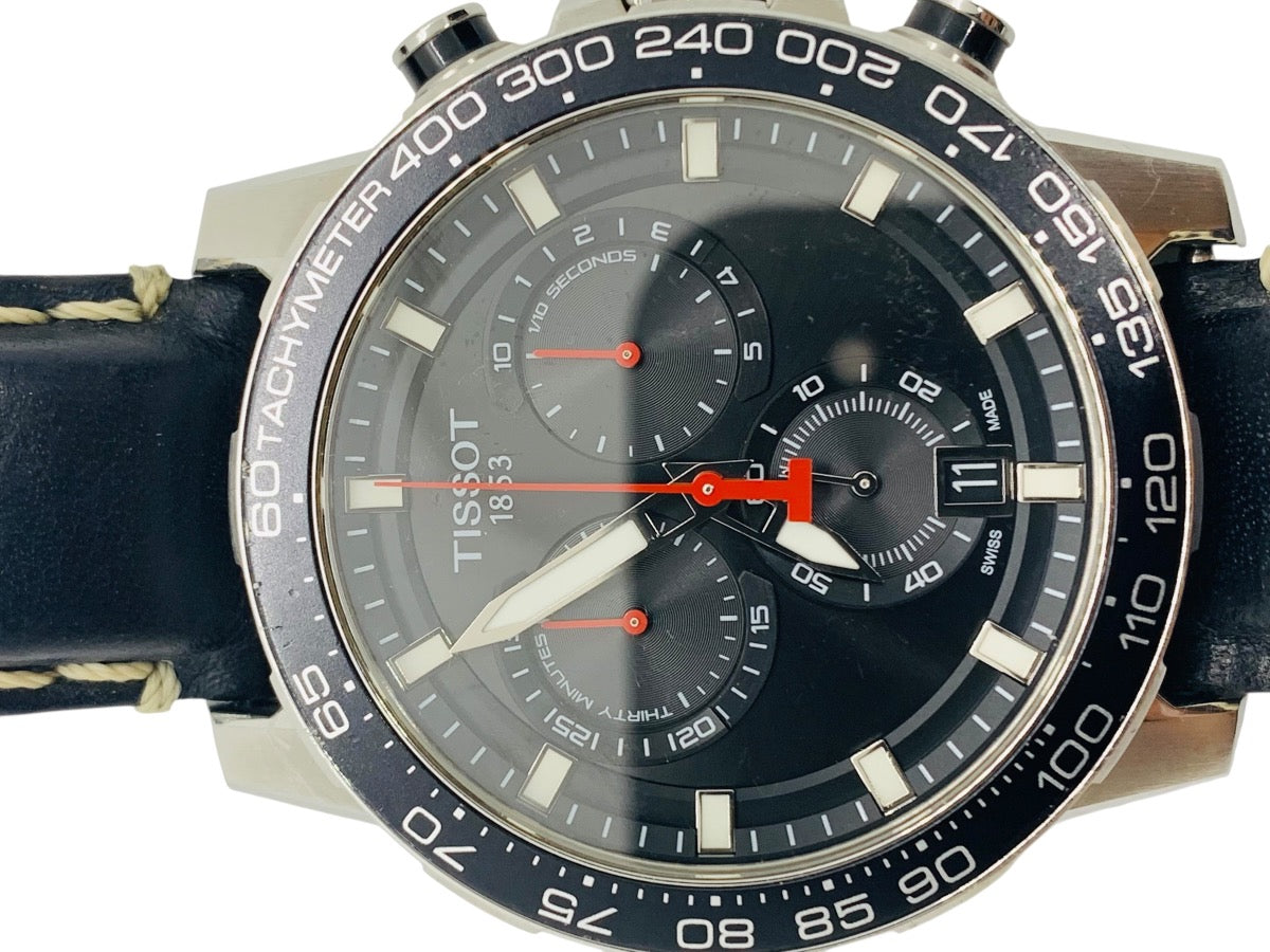 For sale, we have a Tissot Supersport Chrono Black Dial Black Strap Men’s Watch T125617A. This pre-owned quartz watch is ticking well and shows normal signs of prior use. The case has light hairline scratches, and the leather strap shows some peeling along the leather side areas as well as typical creasing.