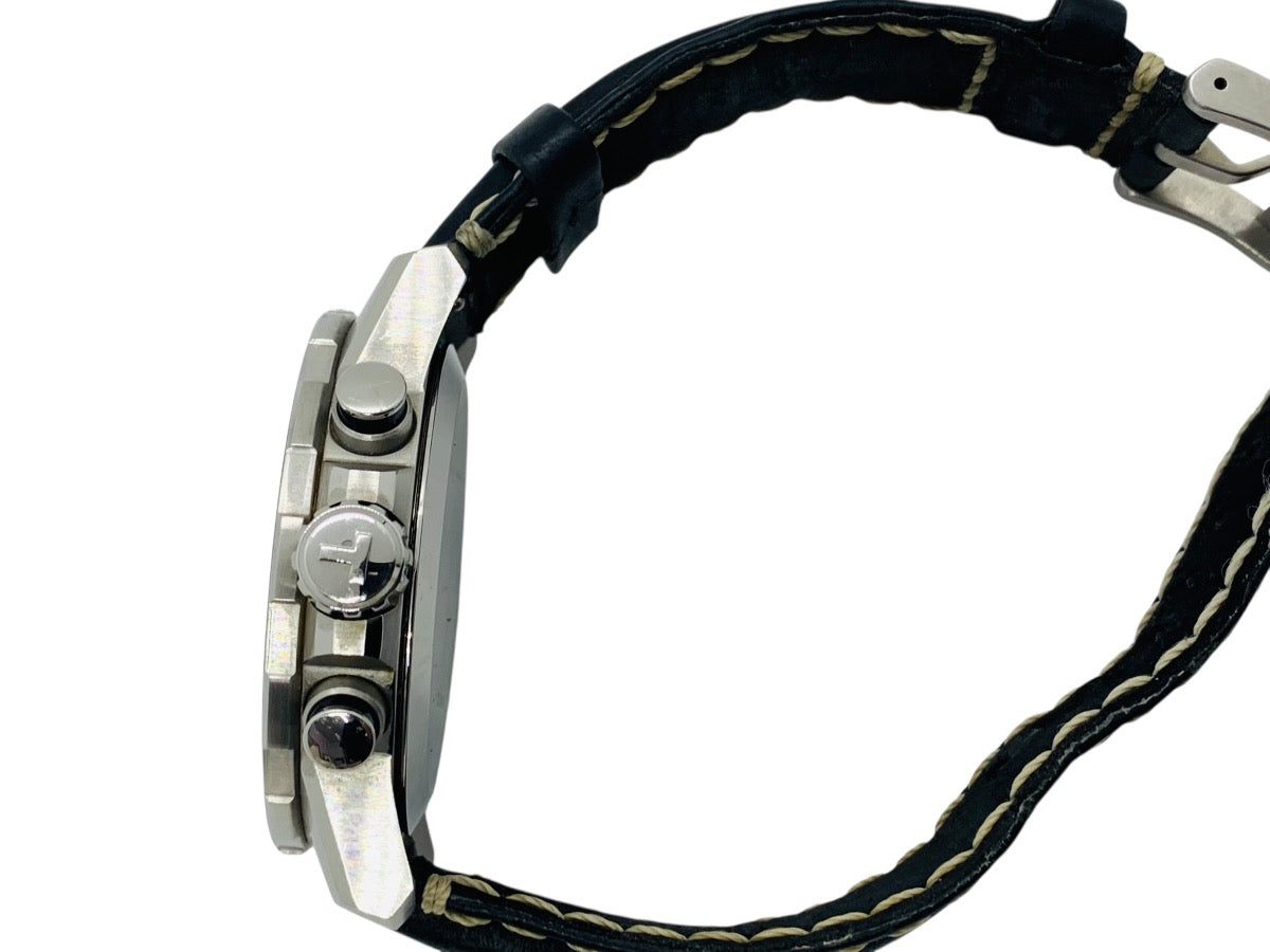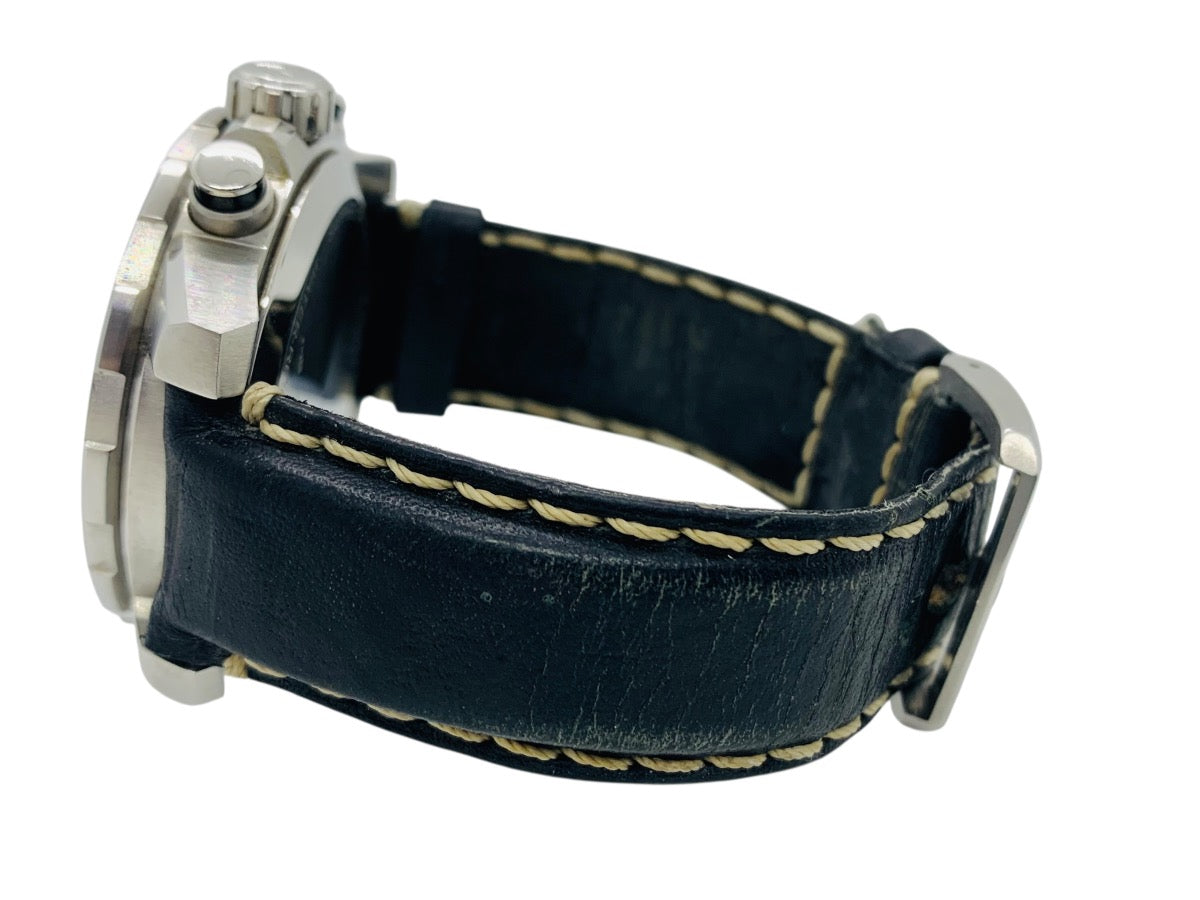 This model features a bold 48mm case and a 22mm lug width, offering a strong wrist presence with a clean black dial and chronograph functionality.